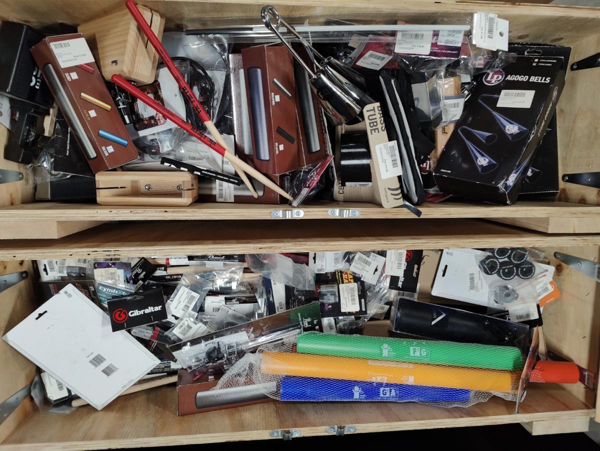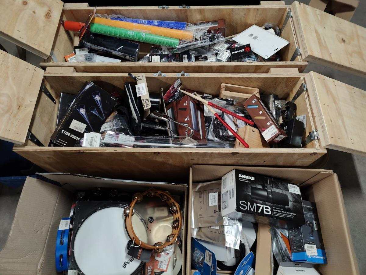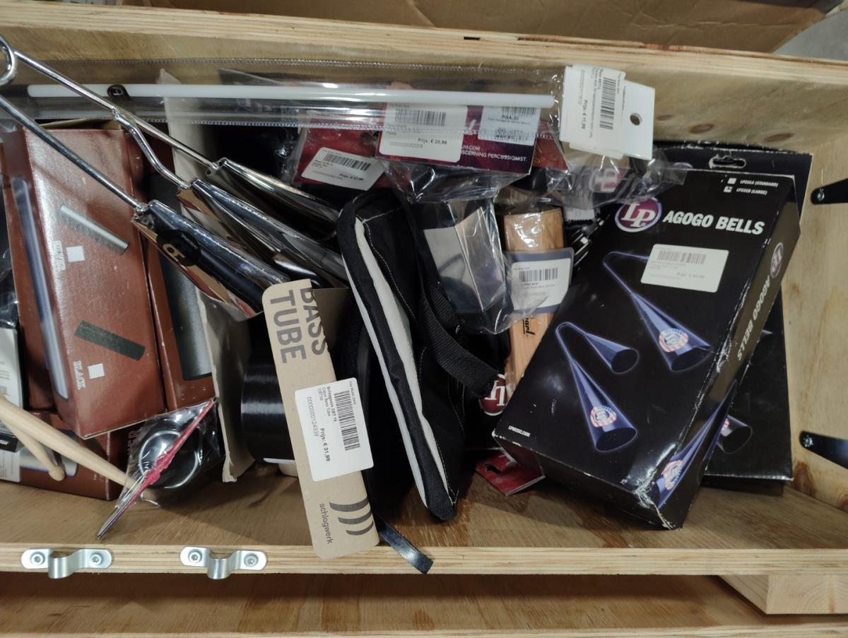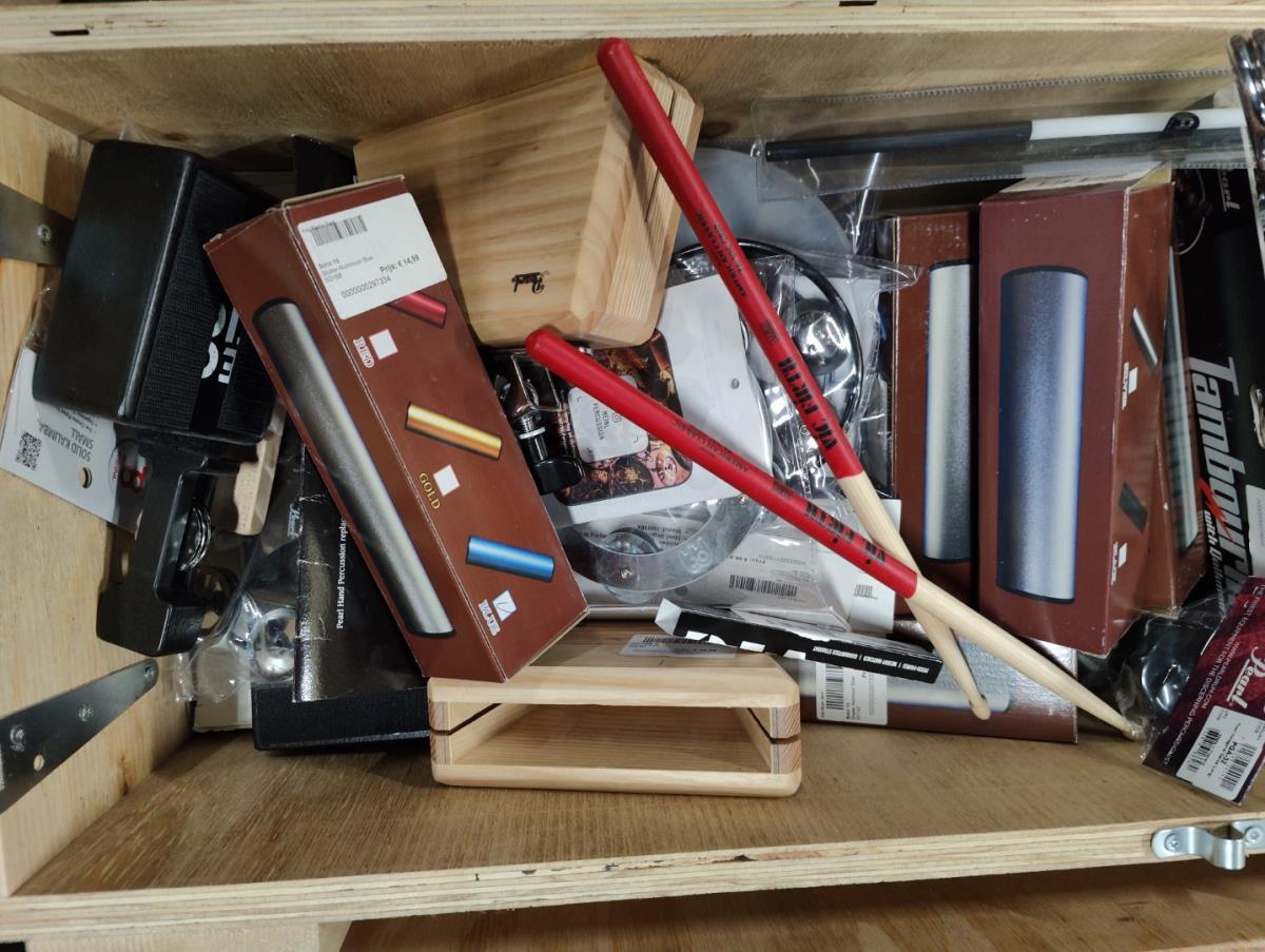 Waaronder: Microfoon SHURE, Microfoon SENHEISER, drumstokken en divers klein materiaal. Liggende in 2 dozen en 5 houten kisten.