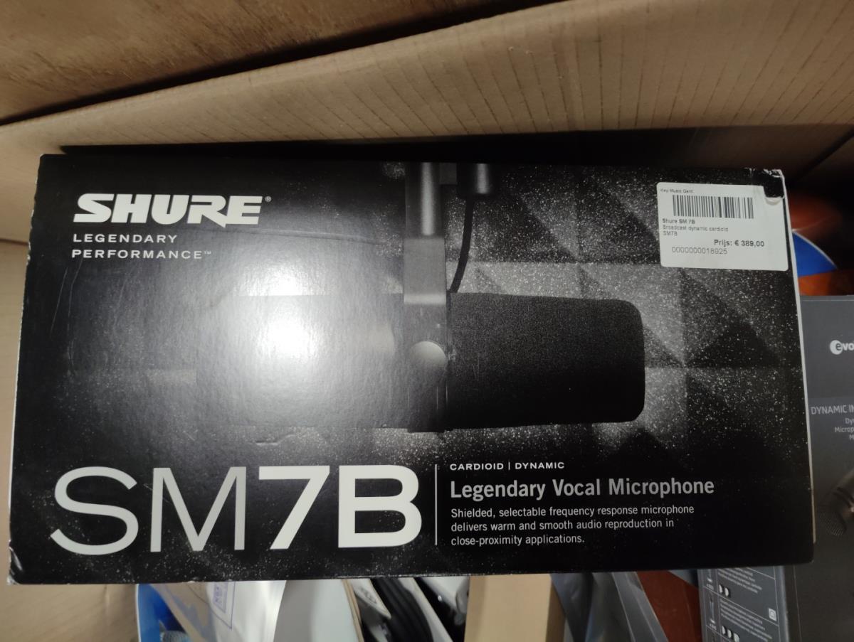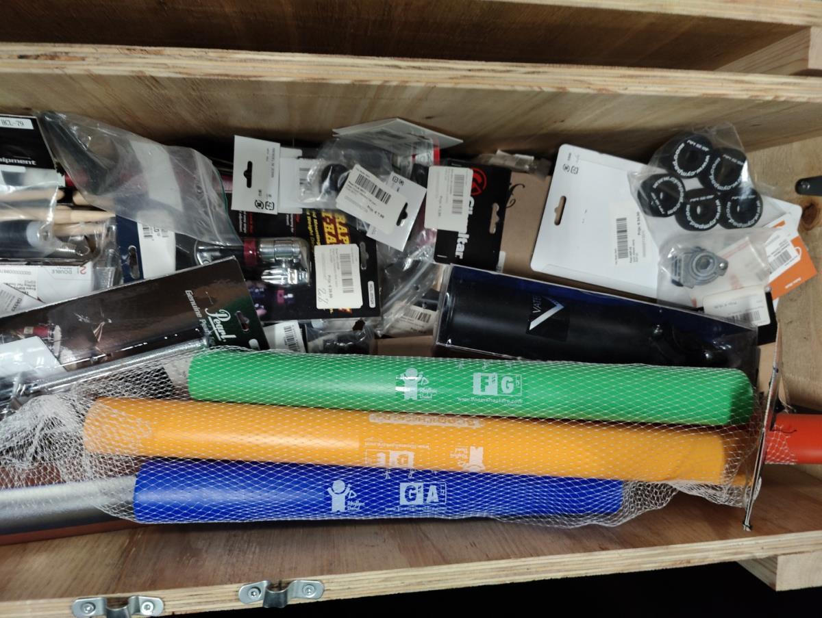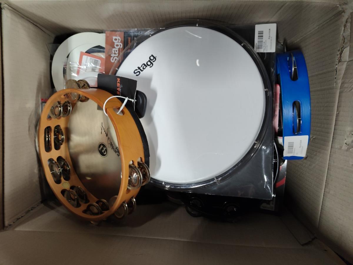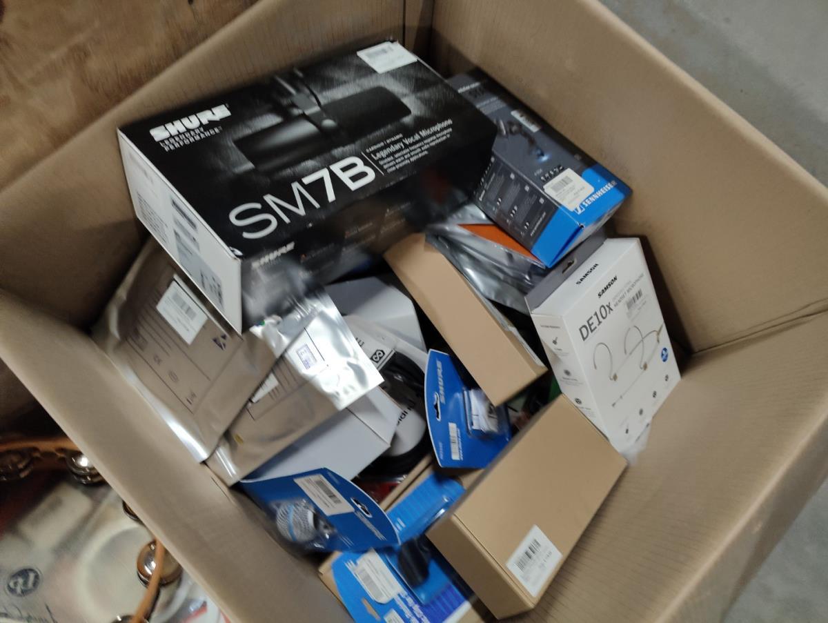 Waaronder: Microfoon SHURE, Microfoon SENHEISER, drumstokken en divers klein materiaal. Liggende in 2 dozen en 5 houten kisten.