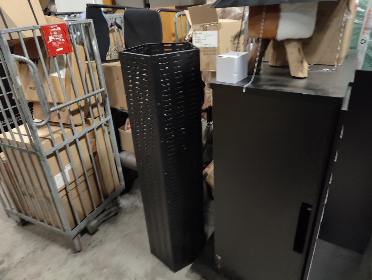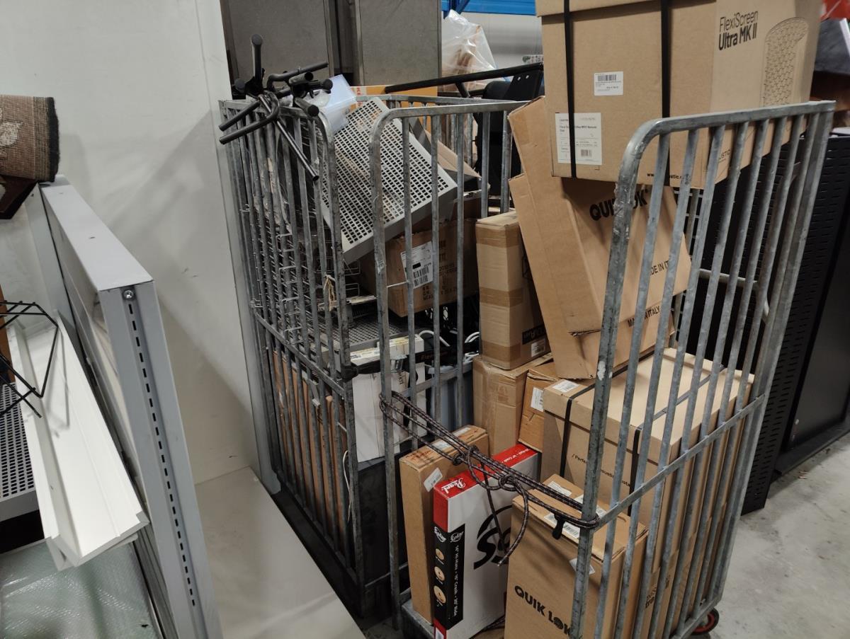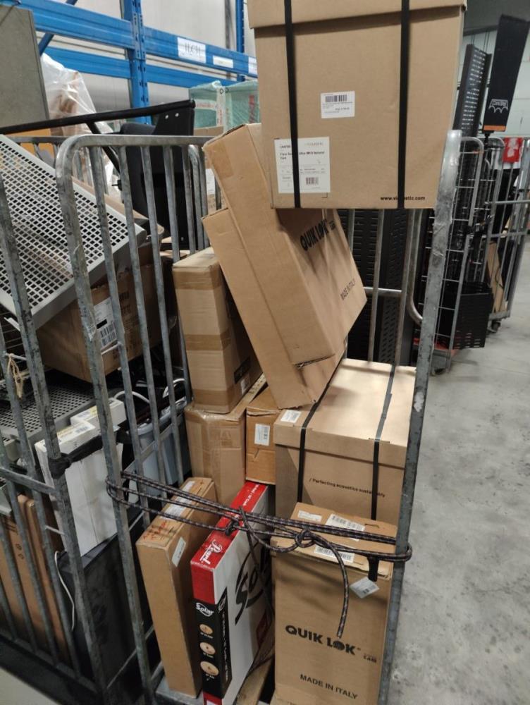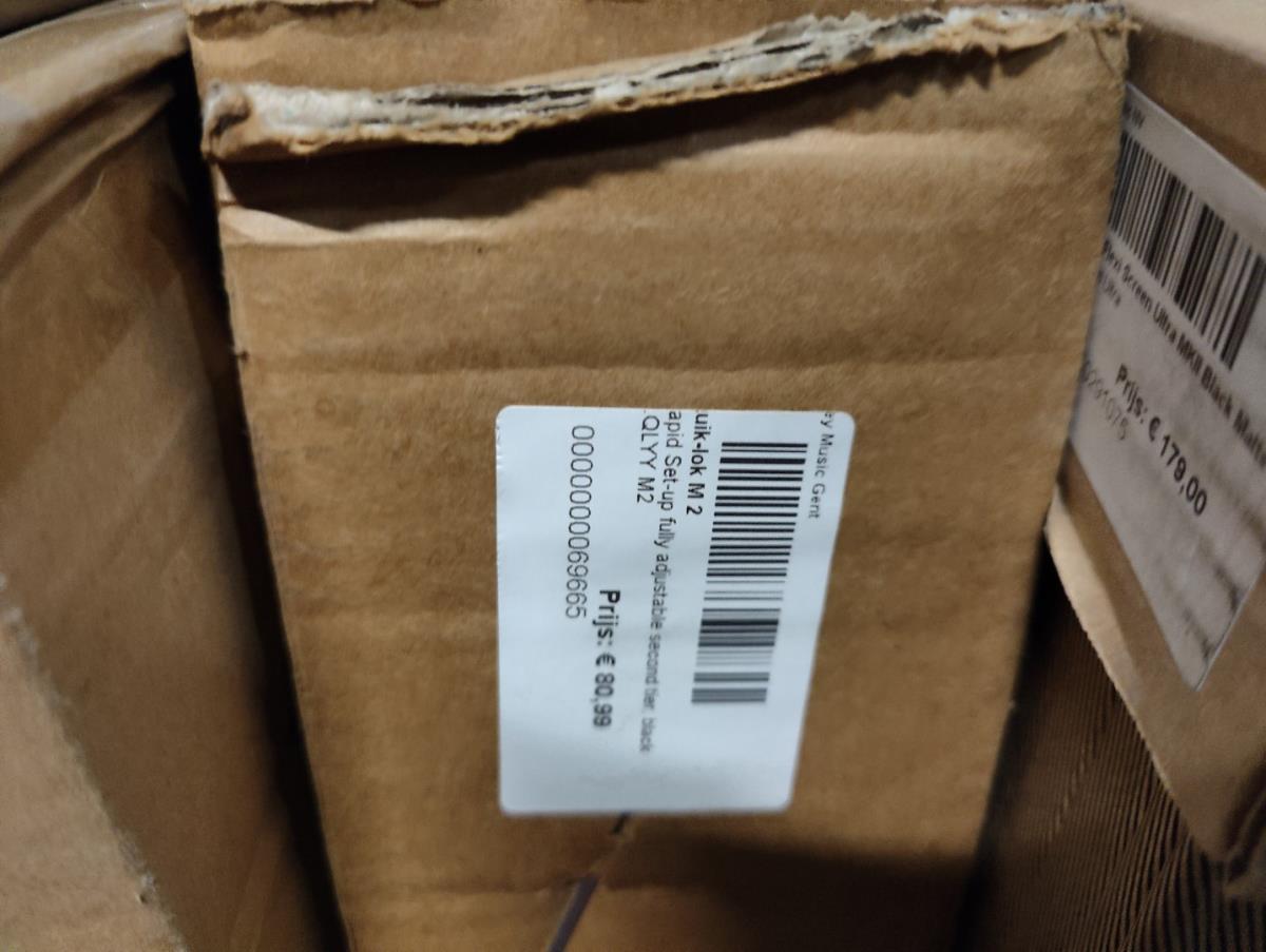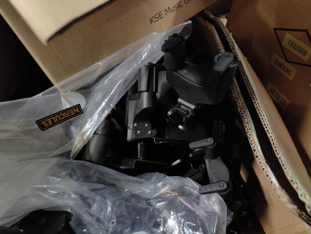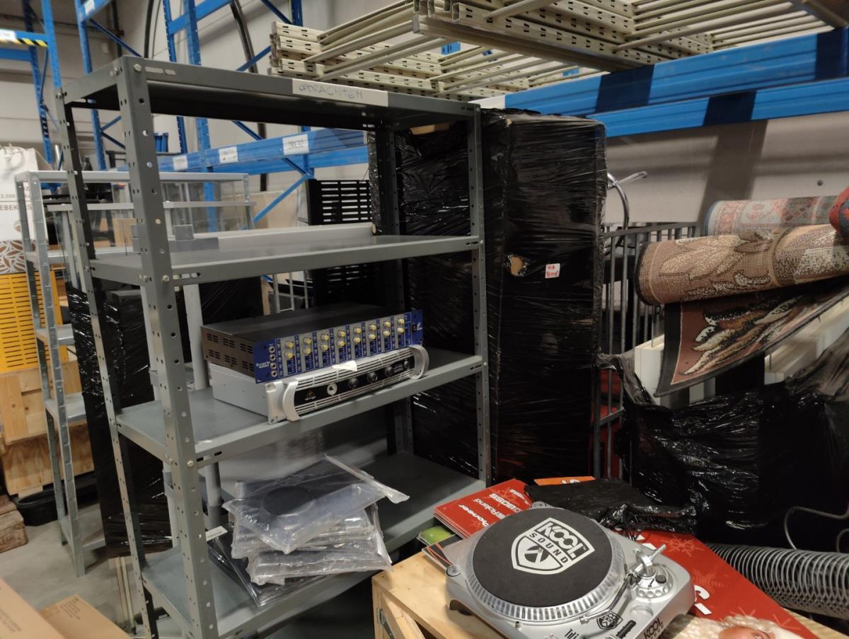 Waaronder: diverse magazijn en kantoor toebehoren, divers meubilair; stoelen, 21 vitrine kasten, winkelrekkenn skai lederen sofa, 1 postkar inhoudende diverse muziek toebehoren, 11 div postkarren, 7 diverse houten opbergkisten met dubelle deur, 2 muziek standen waaronder voor keyboard, 2 metalen opbergrekken, drum tapijten, diverse drum toebehoren, diverse gitaar toebehoren, divers meubilair, 2 terrasverwarmers, partij bistro meubilair, 2 houten kisten, diverse draag beugels HERCULES, diverse bekabeling, diverse presentatie standen. Afgifte volgens aanwijzing. Exclusief trussen.