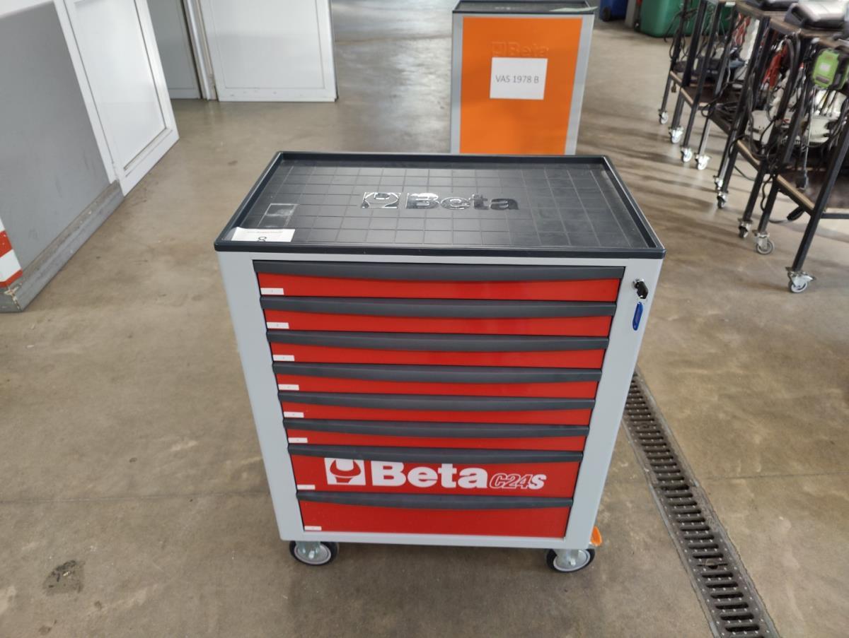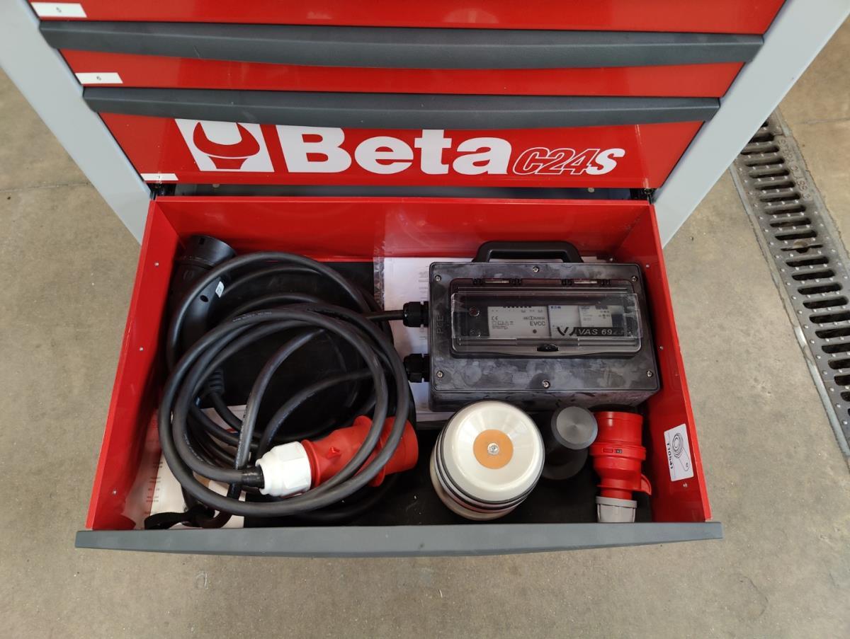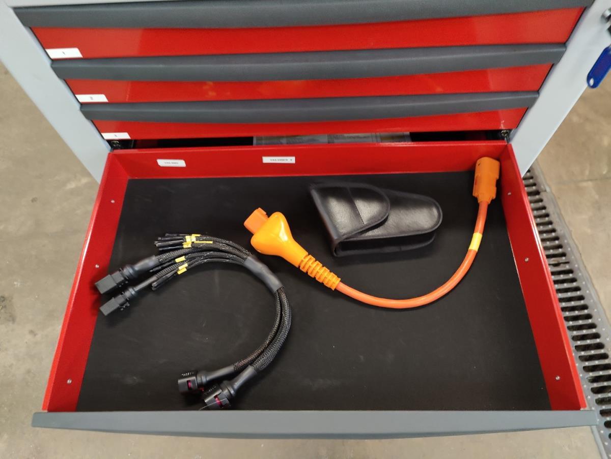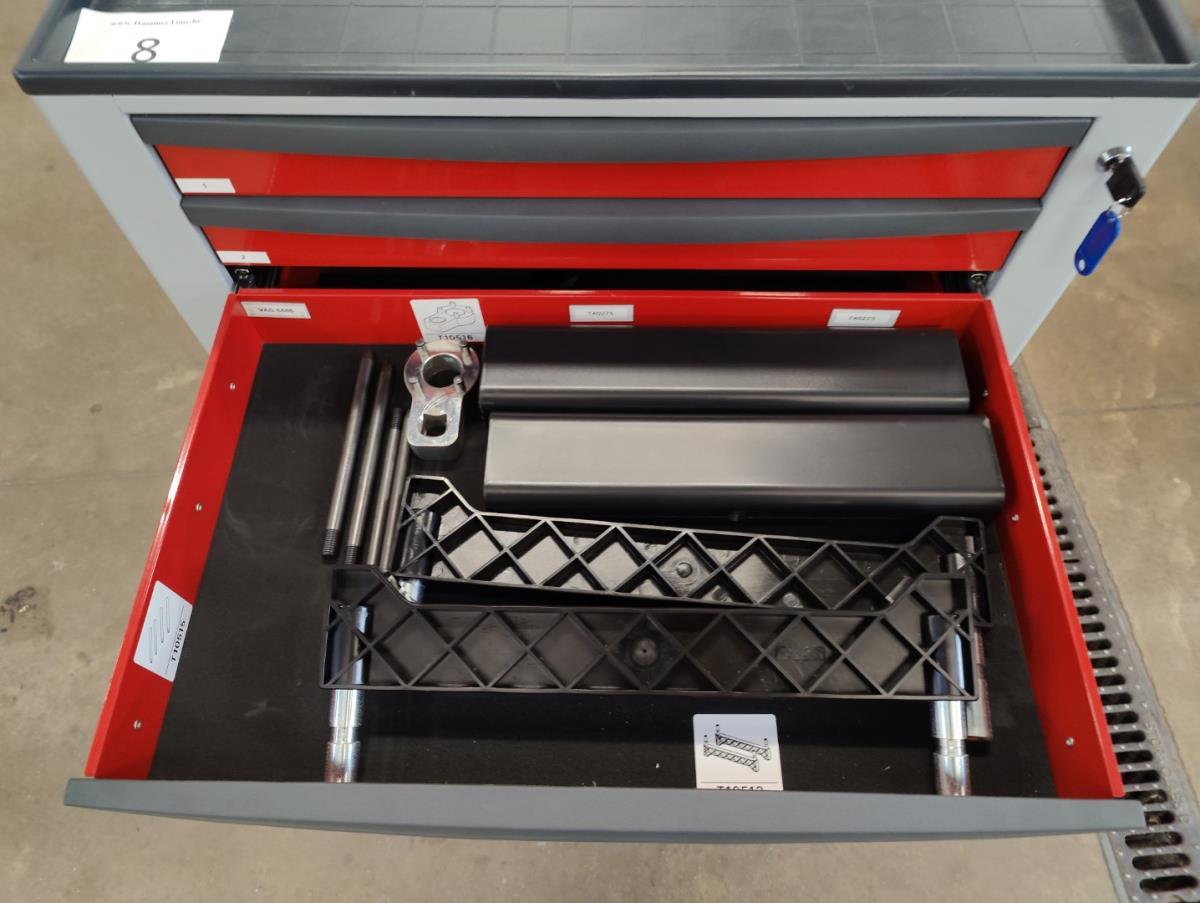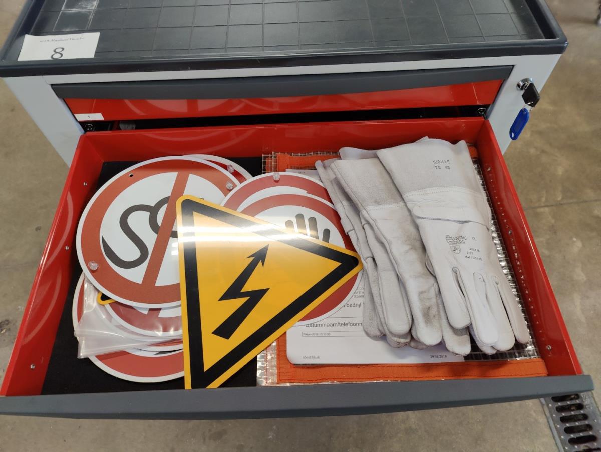 Voorzien van 7 gevulde laden inhoudende diagnose toebehoren, handgereedschap en veiligheidsmateriaal.