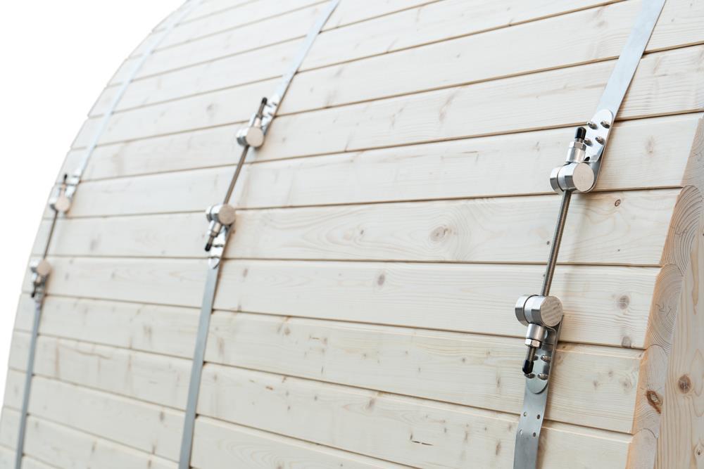 1x Pod sauna met getint glas, houtsoort: Finland Pine; geschikt voor 4-5 personen; inclusief: thermometer, hygrometer, glazen zandloper, hoofdsteun, glazen sauna deur, 6KW kachel 'Harvia', afmetingen: 2100x2100mm