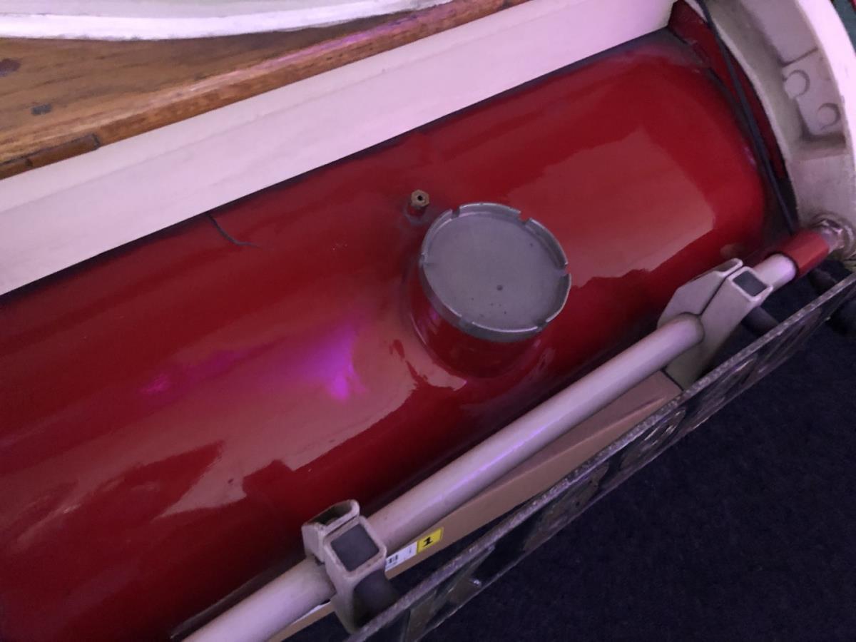 De voorkant is gemaakt van metaal en aluminium en de achterkant (cabine) is gemaakt van kleine houten latjes die met koperen spijkers in vorm zijn gehamerd.