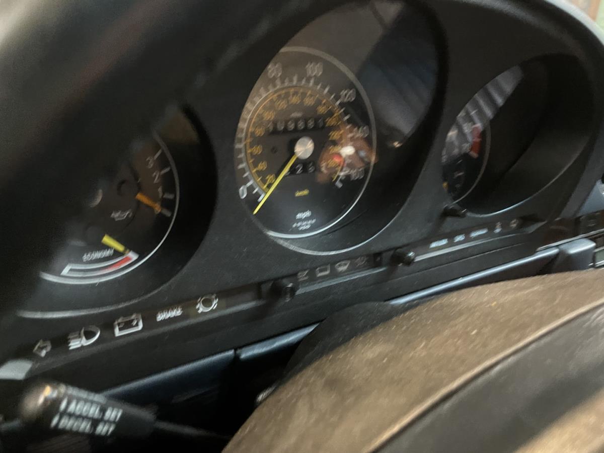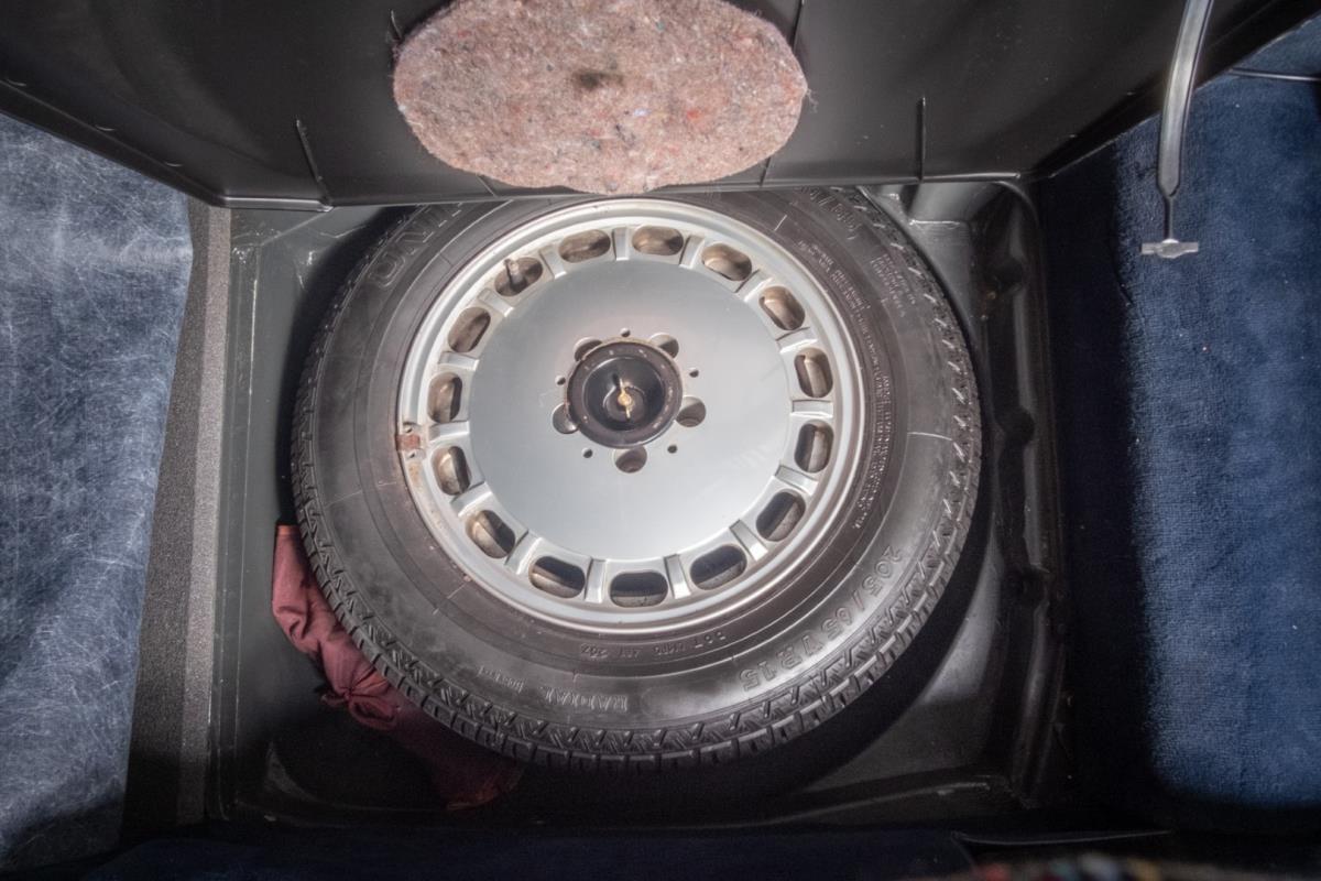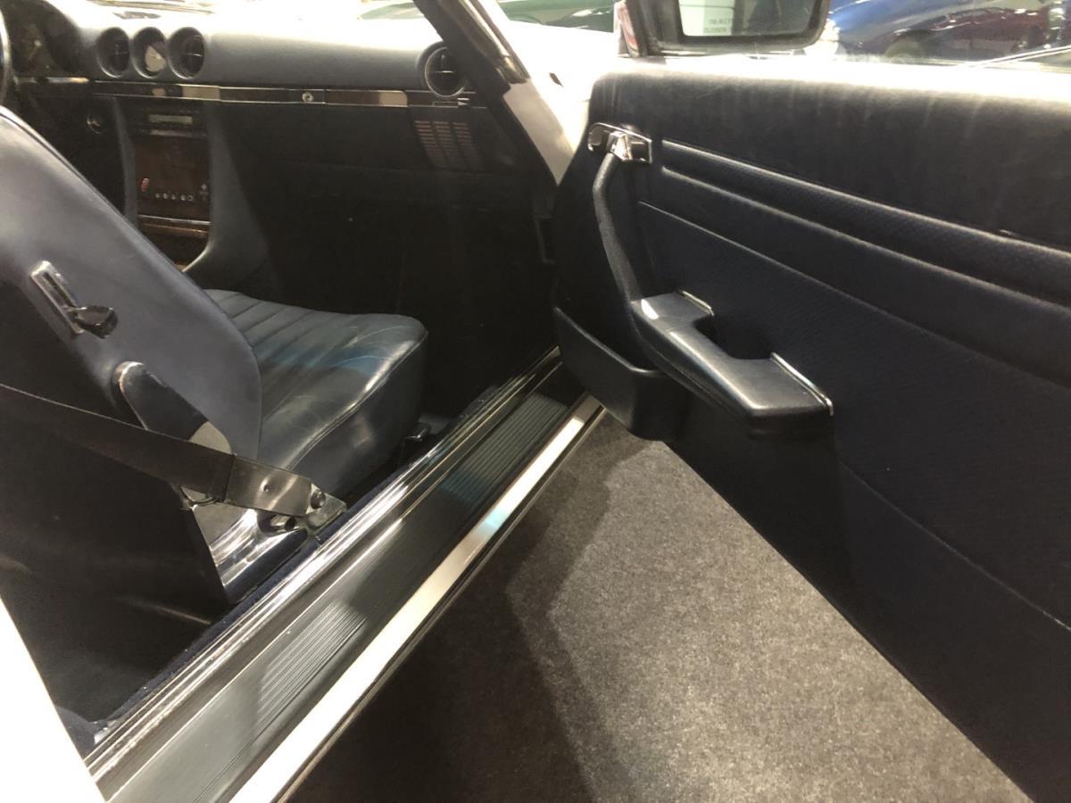 Blauw leder interieur is nog steeds origineel en onbeschadigd evenals de donkerblauwe tapijten in de wagen en de kofferruimte.