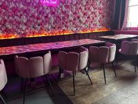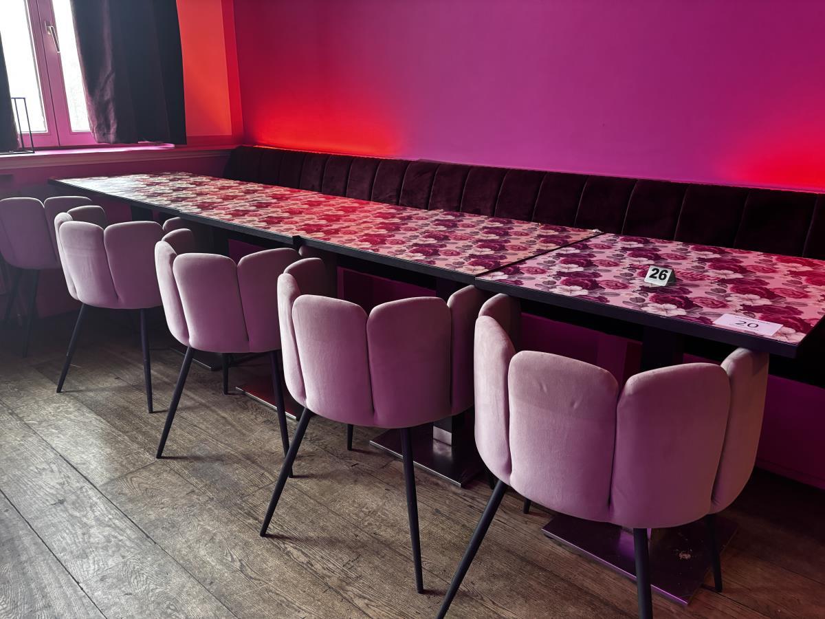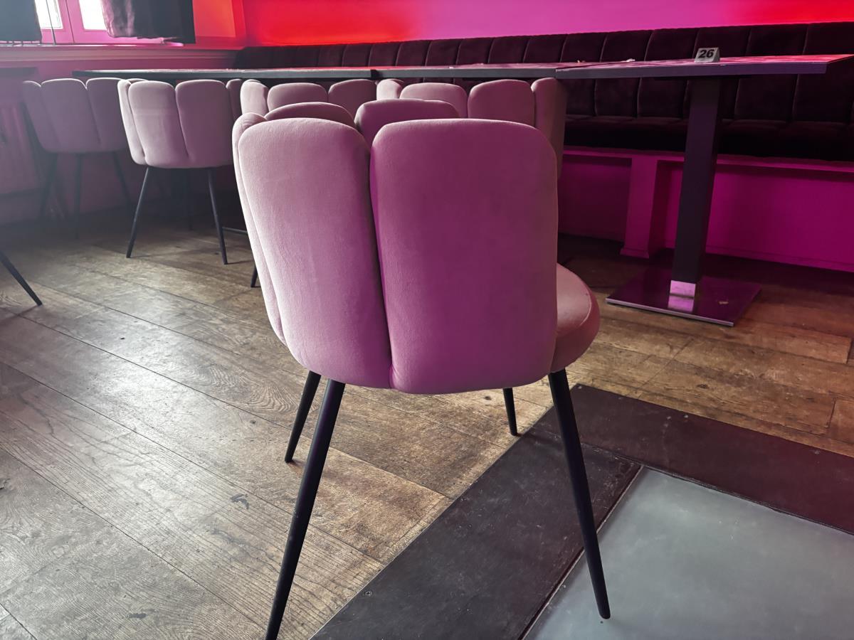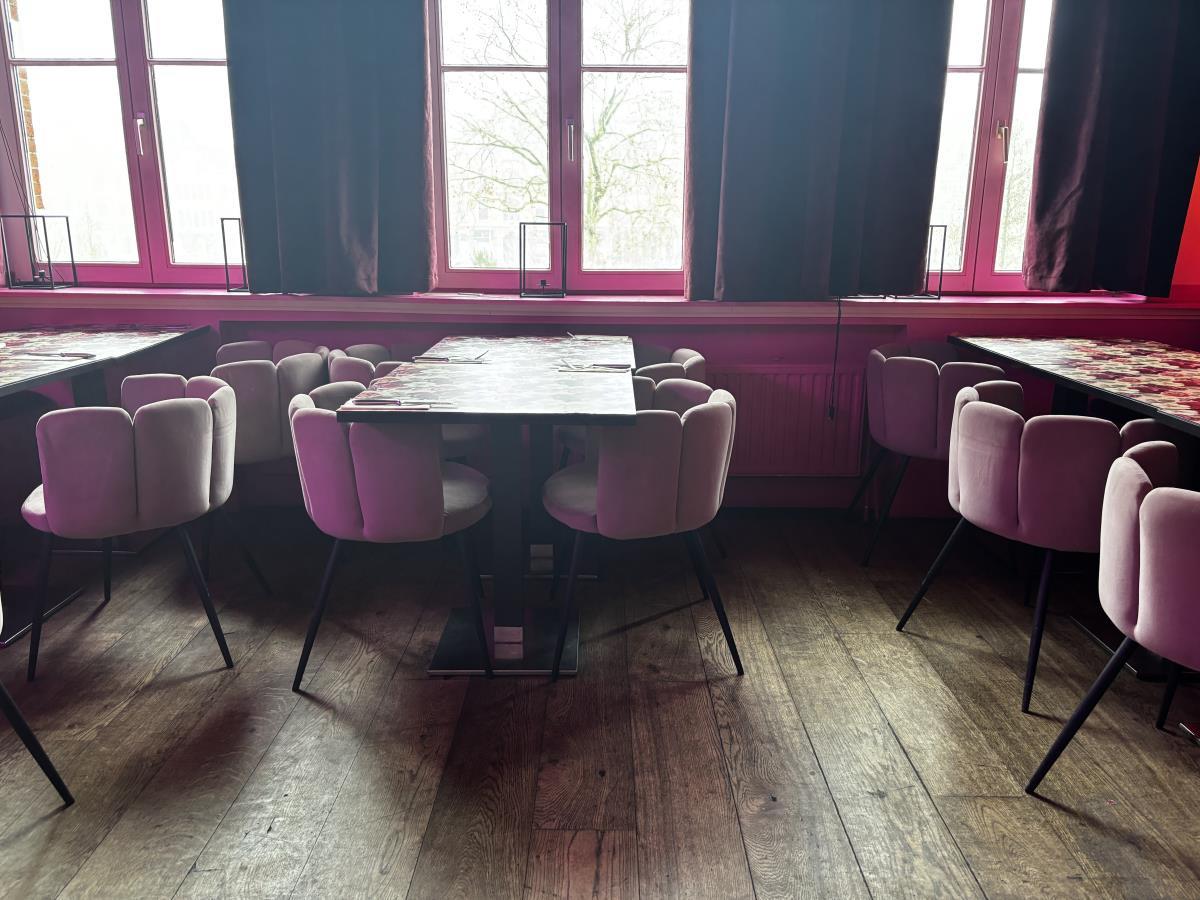bu plm 14 vierkante bistrotafels + plm 17 stoffen roze stoelen + bestekkastje