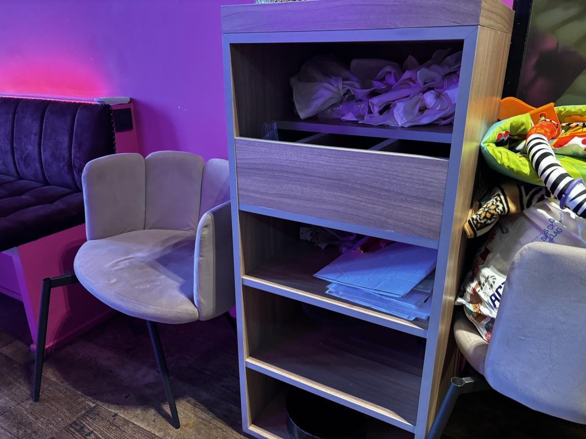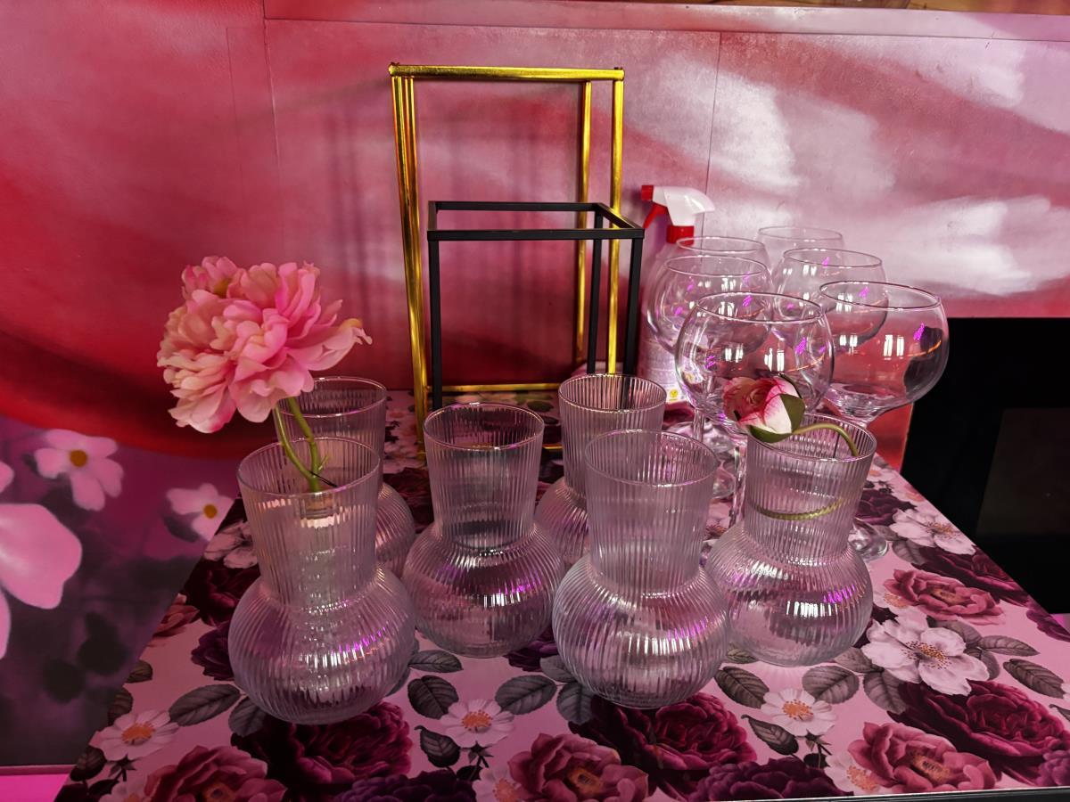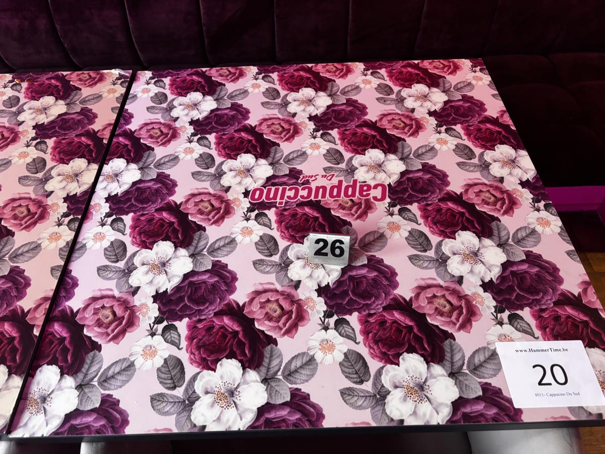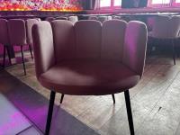 bu plm 14 vierkante bistrotafels + plm 17 stoffen roze stoelen + bestekkastje