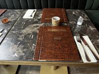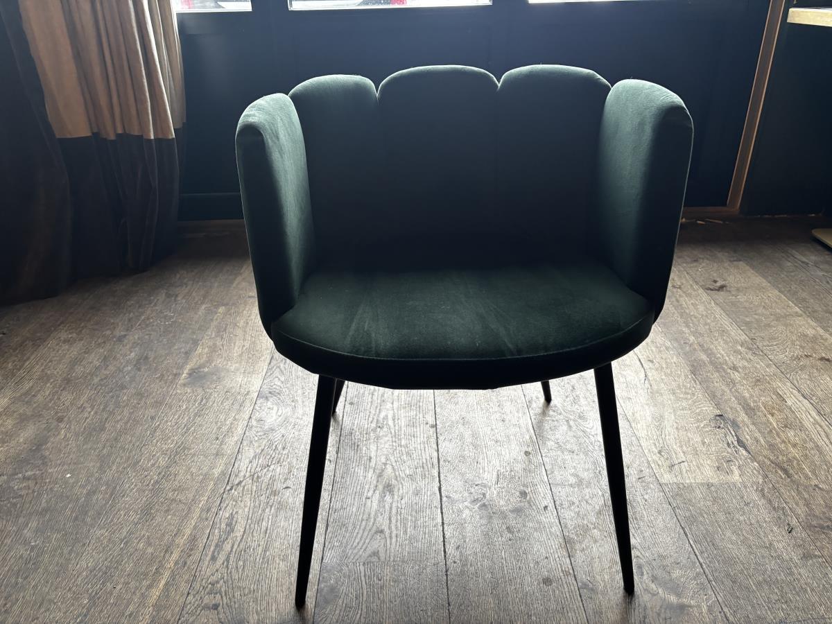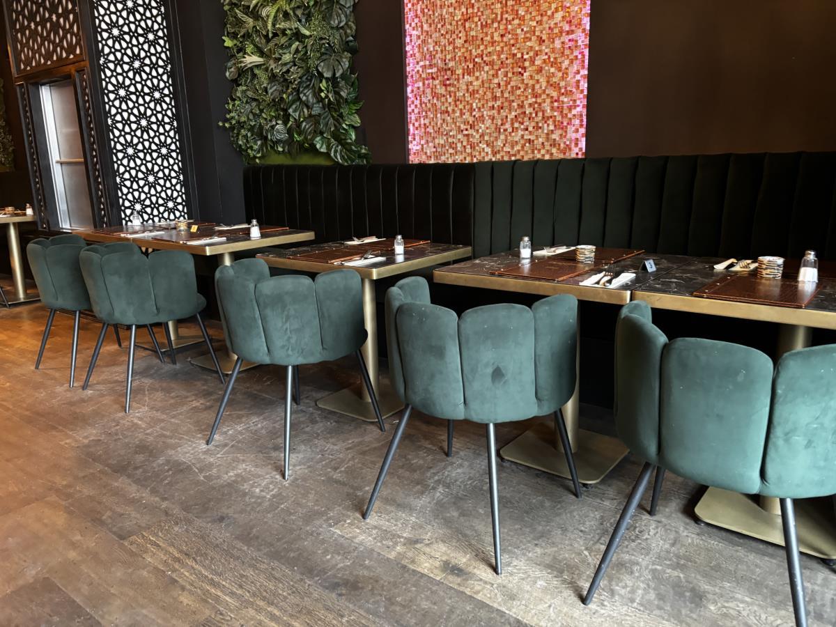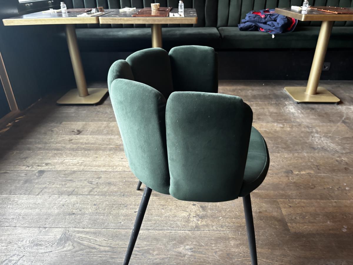 bu plm 16 vierkante bistrotafels + plm 12 groene stoffen stoelen
