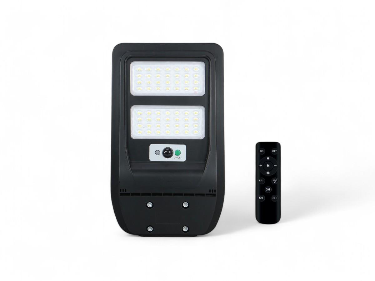 4 x Solar 5000K LED Straatverlichting met Microwave Sensor en Afstandsbediening - lichtkleur daglicht 5000K - waterdicht IP65 - lichtstroom max 750 lumen - product kleur zwart - afm 401.7 x 236.7 x 43mm - stralingshoek 90° - behuizing PC en ABS - zonnepaneel voltage 6V - batterij 5Ah - met microwave sensor - met afstand bediening kan dimmen en timer instellen - werkt totaal meer dan 12uur - bescherming tegen mechanische inslagen IK07 - wandbeugel en bevestiging niet inclusief - sku 1123S