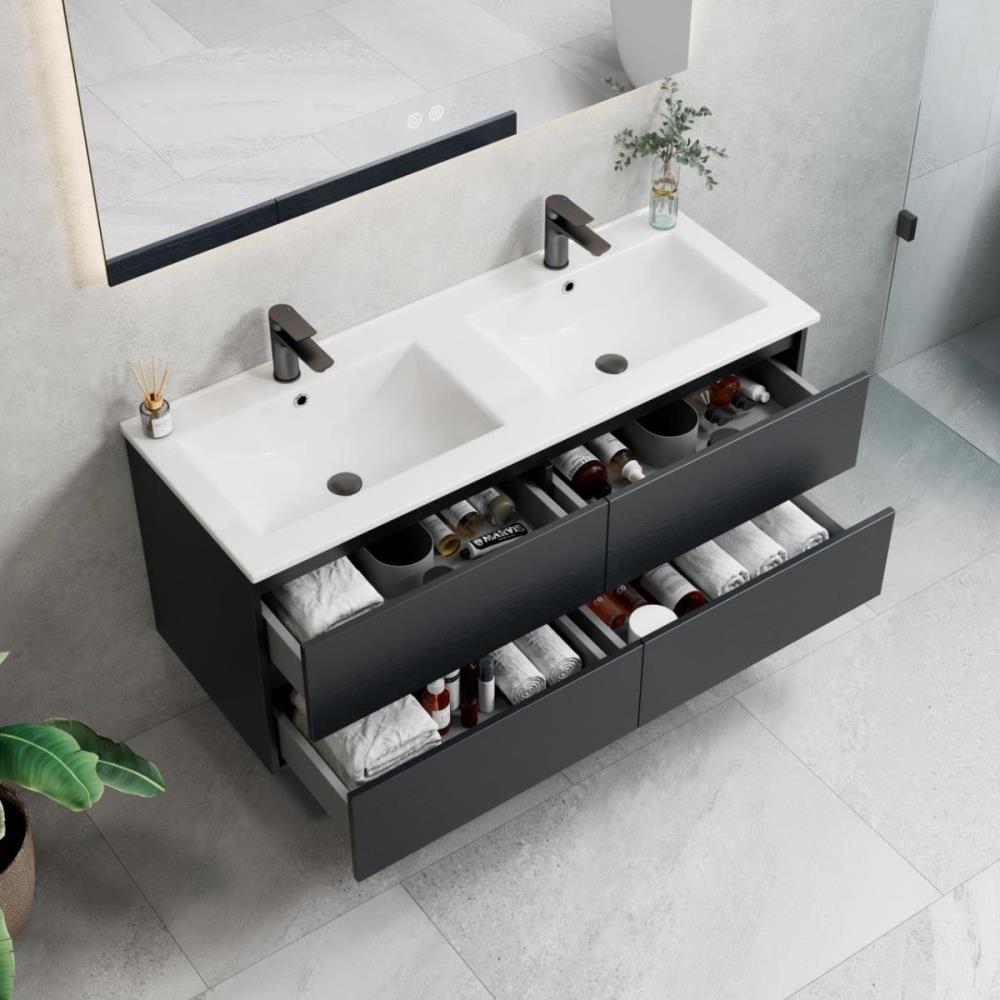 1 x 120 cm Design Badkamermeubel - ROMA 120-06 - Melamine - Kleur: Zwart Eik- Afm. B120xH50xD46CM - LED Spiegel 120x70cm (Verschillende kleurtemperaturen 3000K Warm-wit, 4000K Neutraal-wit, 6500K Koud-wit) + Anti Condens + Alle 3 de kleuren zijn dimbaar, zo kunt u het licht eenvoudig dimmen of feller maken tot het gewenste effect - Mineraalmarmer wastafel- de onderbouwkast van het badkamermeubel bevat 4 laden en is uitgevoerd met een soft close systeem - kraan, krepin, sifon en kolomkast niet inbegrepen