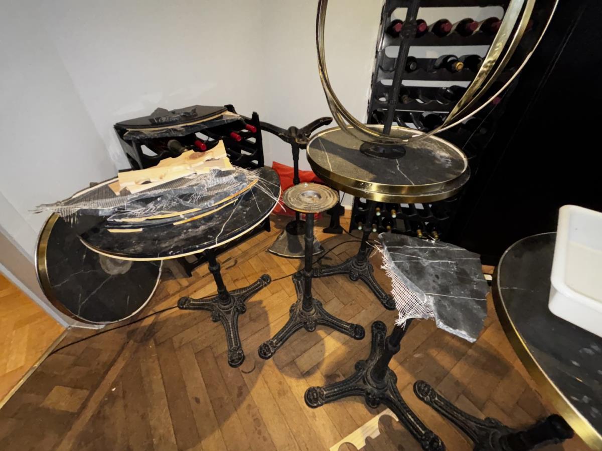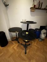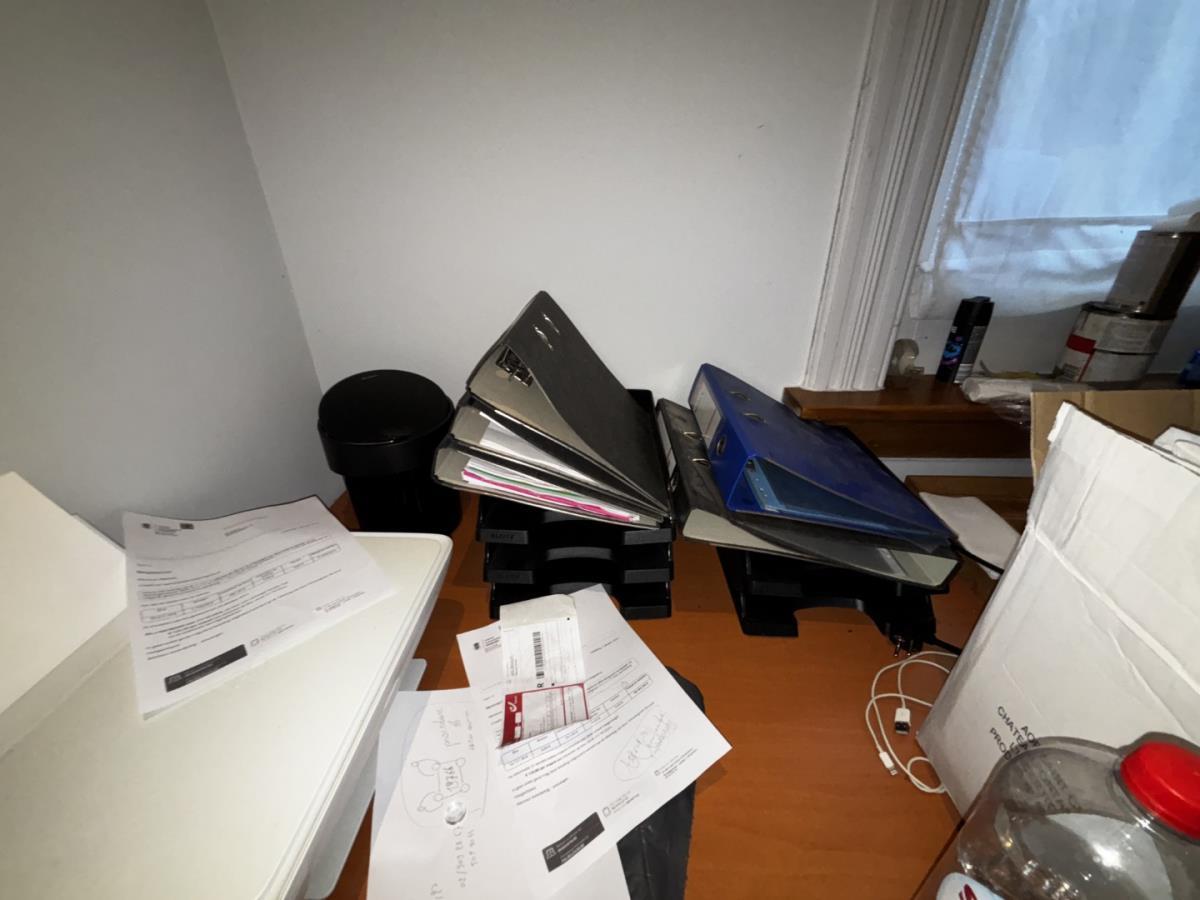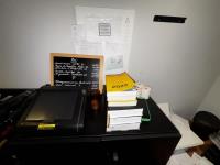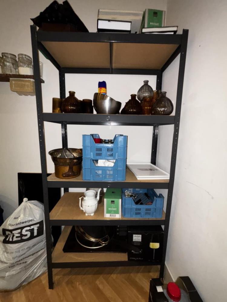 bu oa bureau, kast, printer, rek met deco, parasolvoeten, vaten, vuilbakken, bistrotafels, houten tafelblad, ...koper dient alles mee te nemen, afgifte volgens aanwijzing.