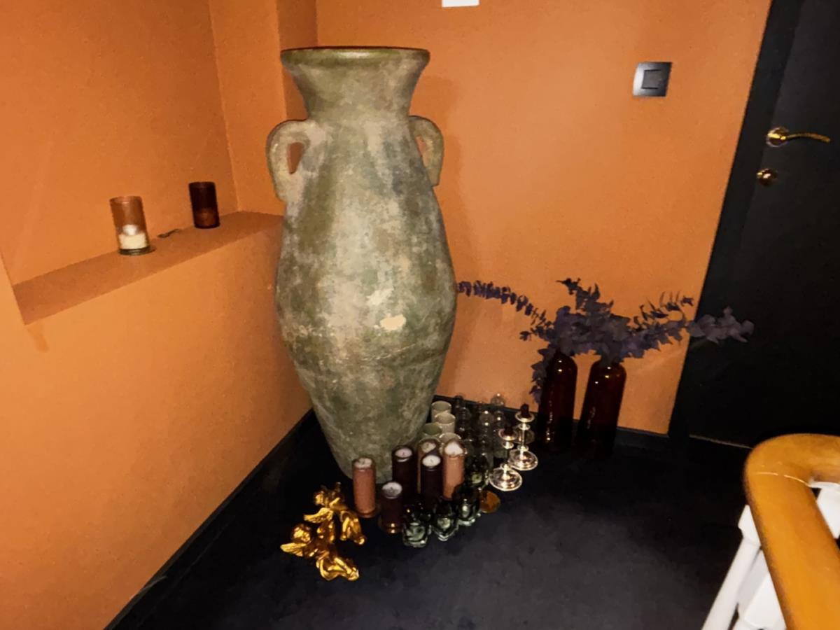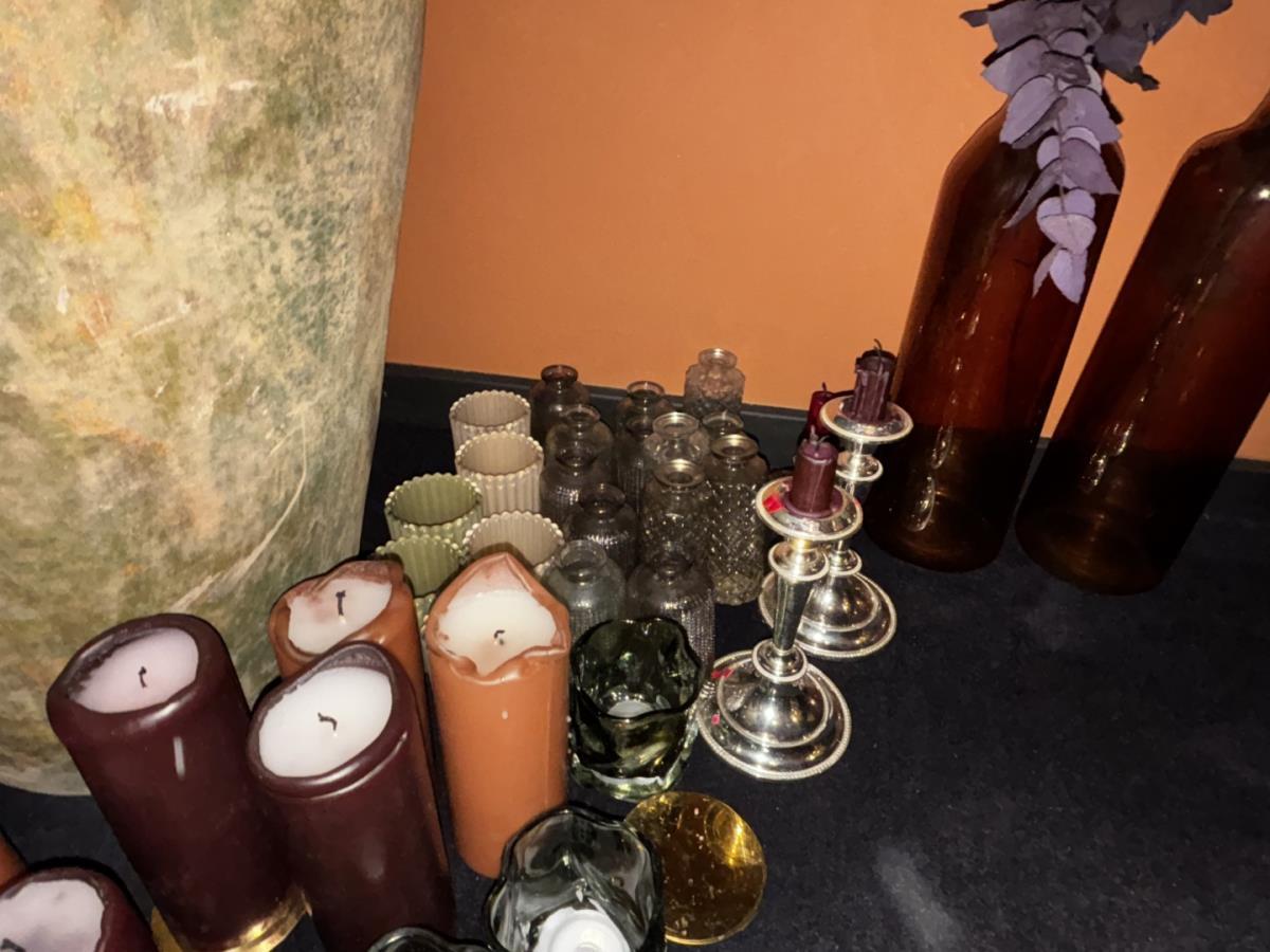 Staat op 1ste verdieping, bu grote kruik, div vaasjes, kaarsenhouders, kaarsen ea