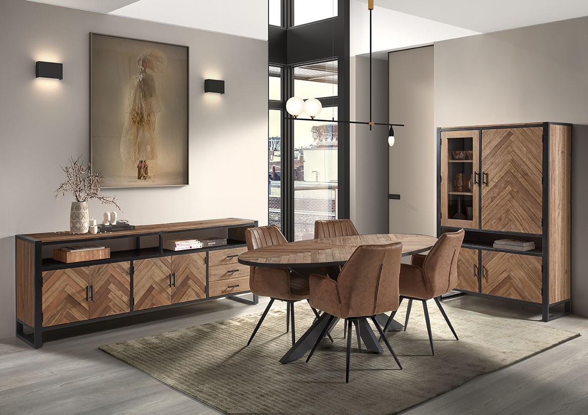 Vitrinekast 4 deuren in massief gerecycleerd hardhout en metalen achterwand 120x45xH180 cm