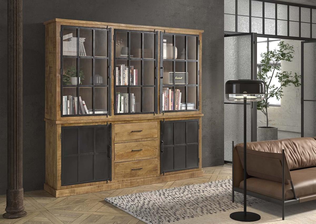 Tweedelige vitrinekast (boven- en onderkast) in massief mangohout en metaal 220x45xH210 cm
