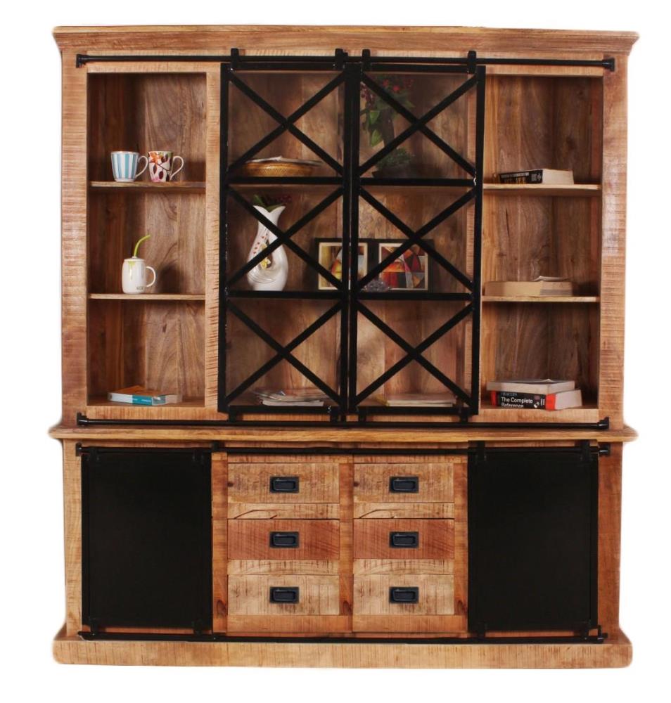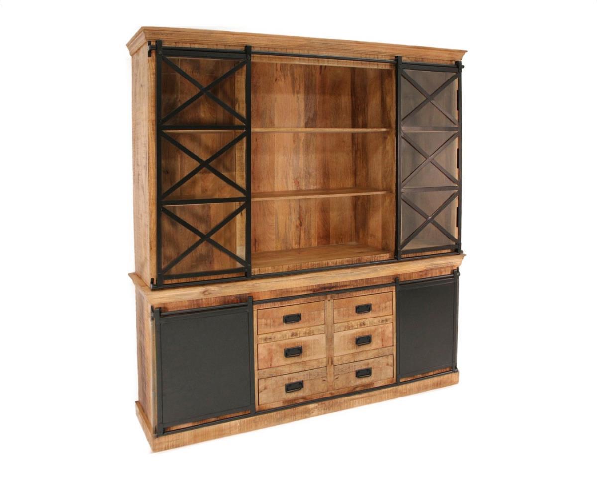 Vitrinekast met vier deuren in massief mangohout en metalen deuren 200x45x215 cm