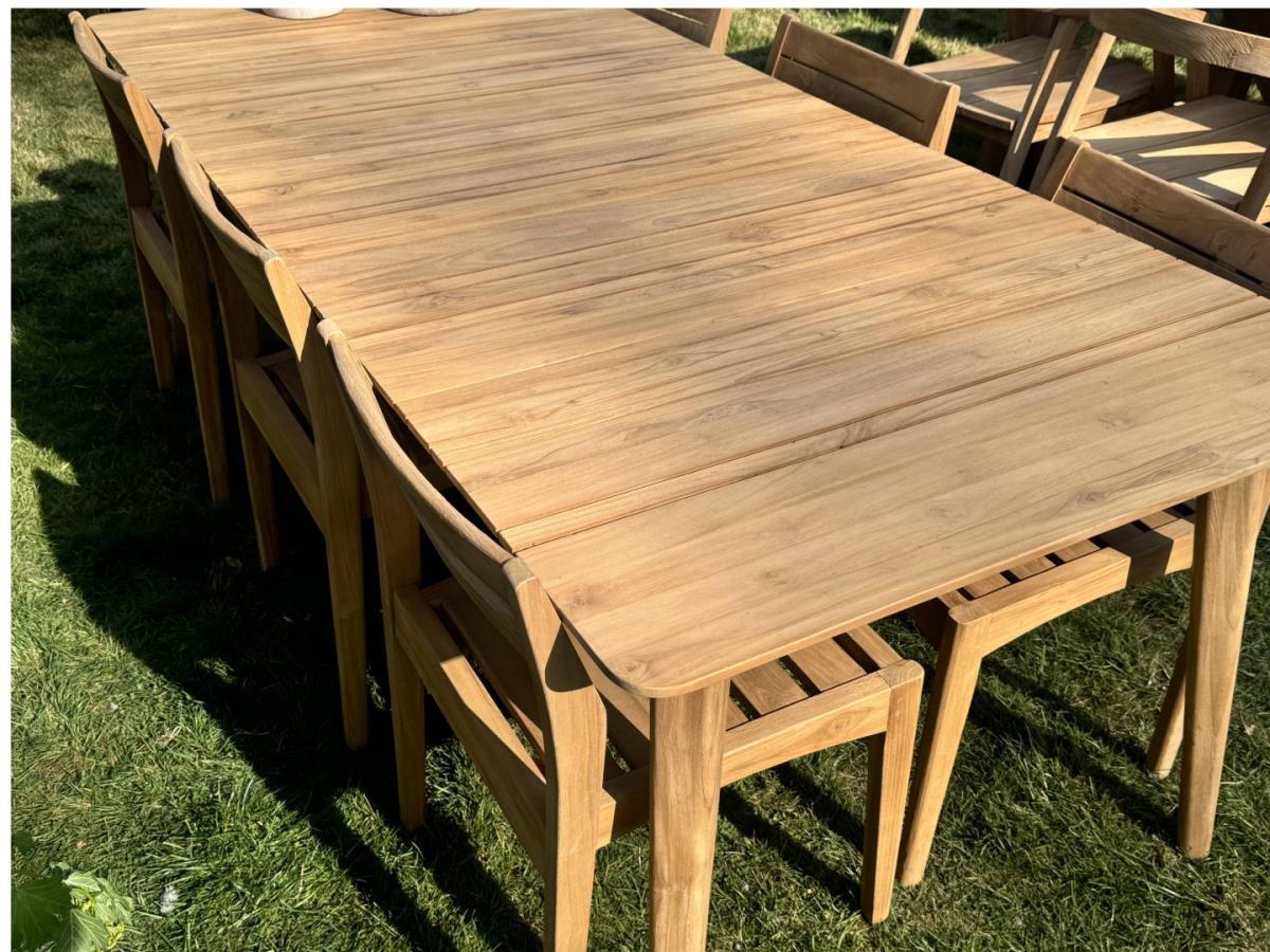 Deze tafel combineert subtiele elegantie met de warmte van massief teak.Het slanke onderstel, de afgeronde hoeken en het mooi afgewerkte tafelblad geven haar een lichte, verfijnde uitstraling, zonder aan stevigheid in te boeten.240 × 100 cm – geschikt voor 6 tot 8 personen.220 × 100 cmx76 – geschikt voor 6 tot 8 personen