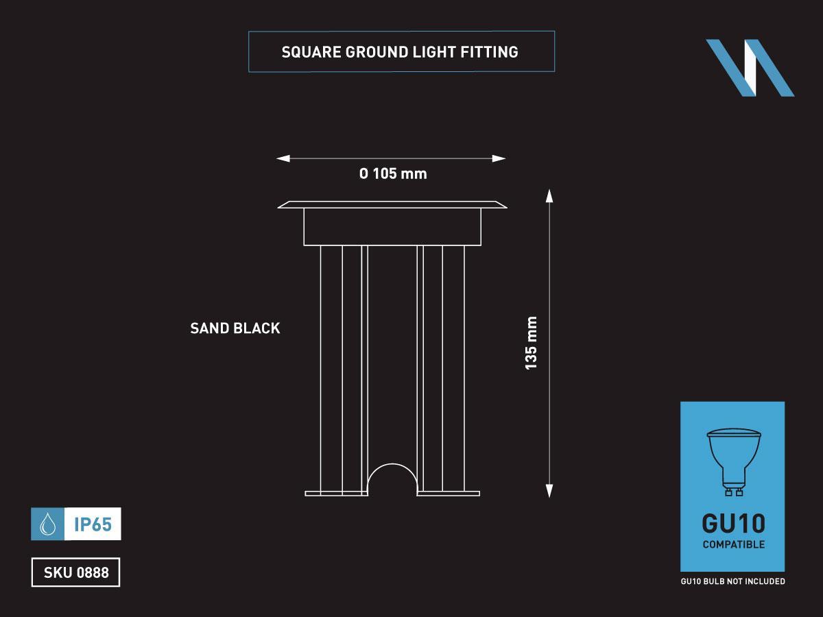 6 x GU10 Grondspot vierkant zand zwart - IP65 waterdicht - materiaal roestvrij staal RVS en glas - afm 105mm x 105mm x 135mm- voltage 220-240V - bevestiging niet inclusief - geschikt voor binnen en buiten - GU10 spot niet inclusief - SKU 00888