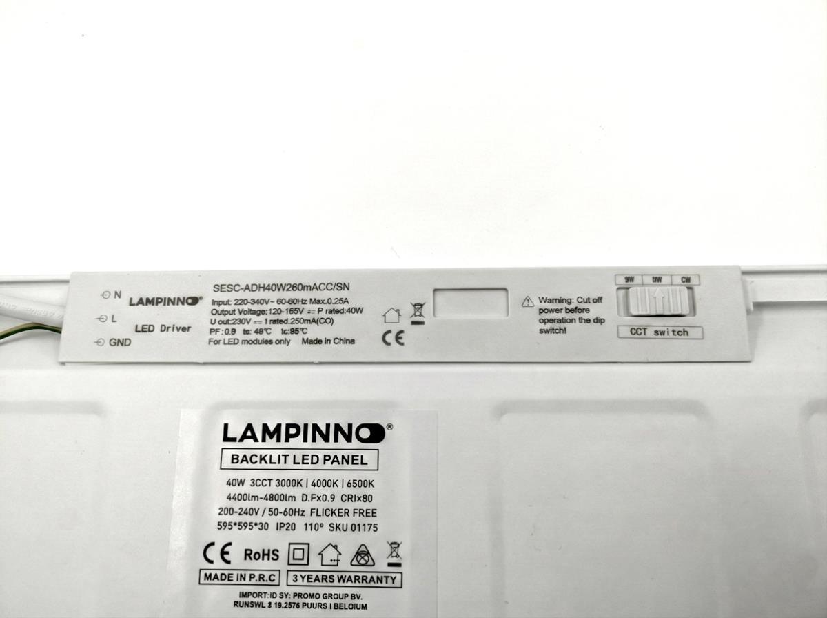 10 x 40 watt Driekleur CCT 60x60 Inbouw Backlit LED Panelen wit - lichtstroom 4400-4800 lumen - flikervrij - lichtkleur 3 in 1 CCT switch warm wit neutraal wit en daglicht dat de kleurtemperatuur kan geschakeld worden tussen 3000K 4000K 6500K - afdichting IP20 - stralingshoek 110° - product kleur mat wit - afm. 595 x 595 x 30 mm - materiaal ijzer en PC - bevestigingsset niet inclusief - levensduur 25.000 uren - voltage 220-240V - SKU 1175