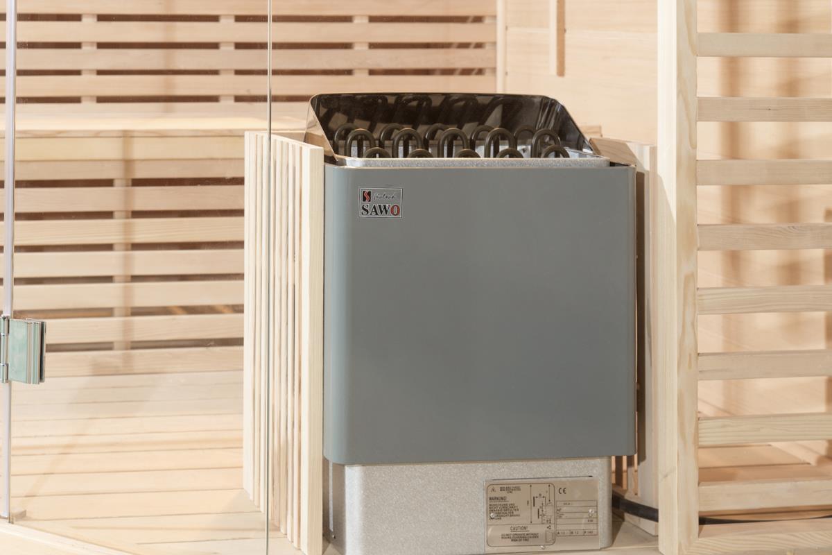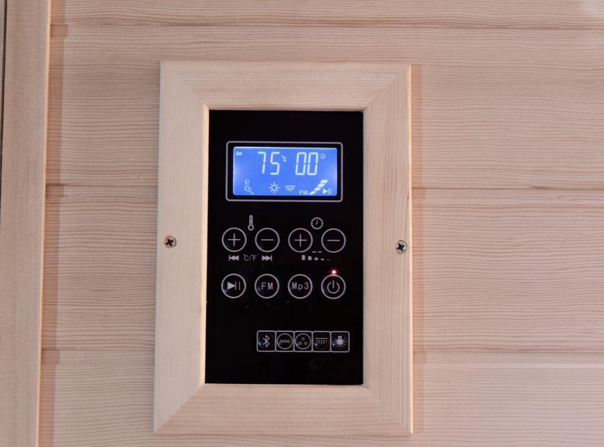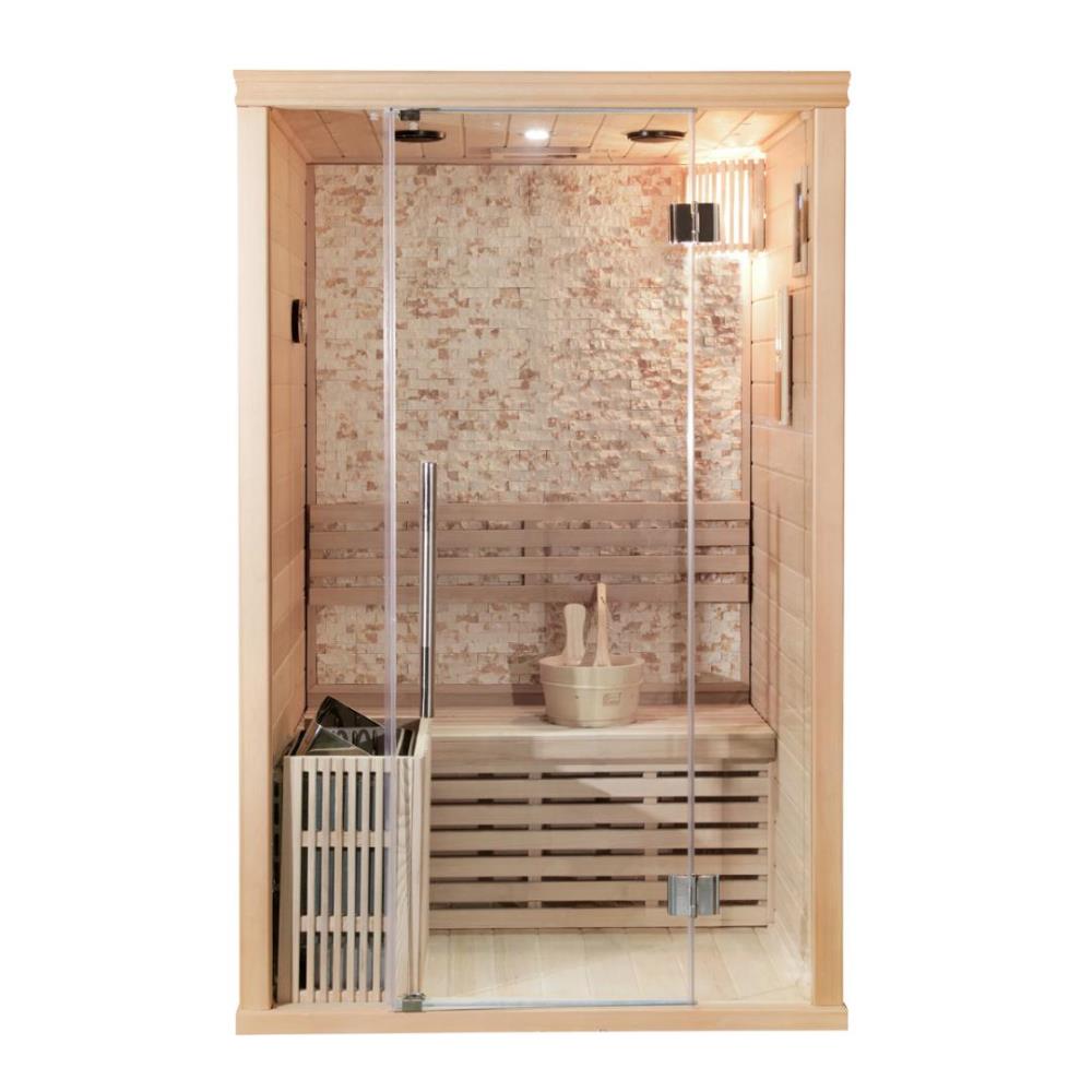 Comfort, 02, houtsoort: Canada hemlock, met led sfeer verlichting, vol glas voorkant 8 mm veiligheidsglas, rvs heater en digitaal controller, thermometer en hygrometer, glazen timer, lava steen, geschikt voor 1-2 personen, Uitsluitend samengesteld uit de beste materialen, afm: 120x105x190cm (l x b x h). Nieuw